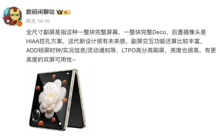相关爆料显示:“全尺寸副屏是指这种一整块完整屏幕,一整块完整Deco,后置摄像头是HIAA挖孔方案,这代新设计很有未来感,副屏交互功能还算比较丰富,AOD锁屏时钟/实况信息/灵动通知等,LTPO高分高刷屏,亮度也很高,有更高度的双屏可用性~ ”